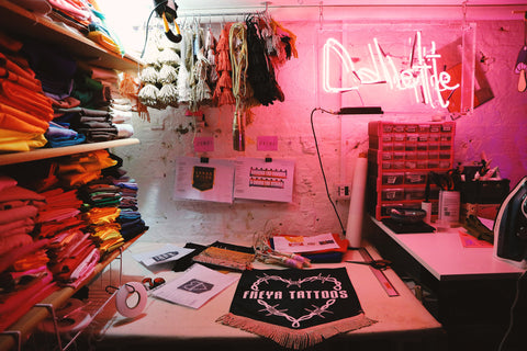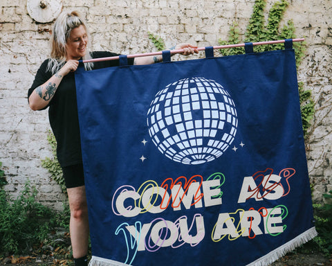 Every banner is carefully hand cut and hemmed at my textile studio in Manchester, with each letter securely stitched down to ensure lasting durability.